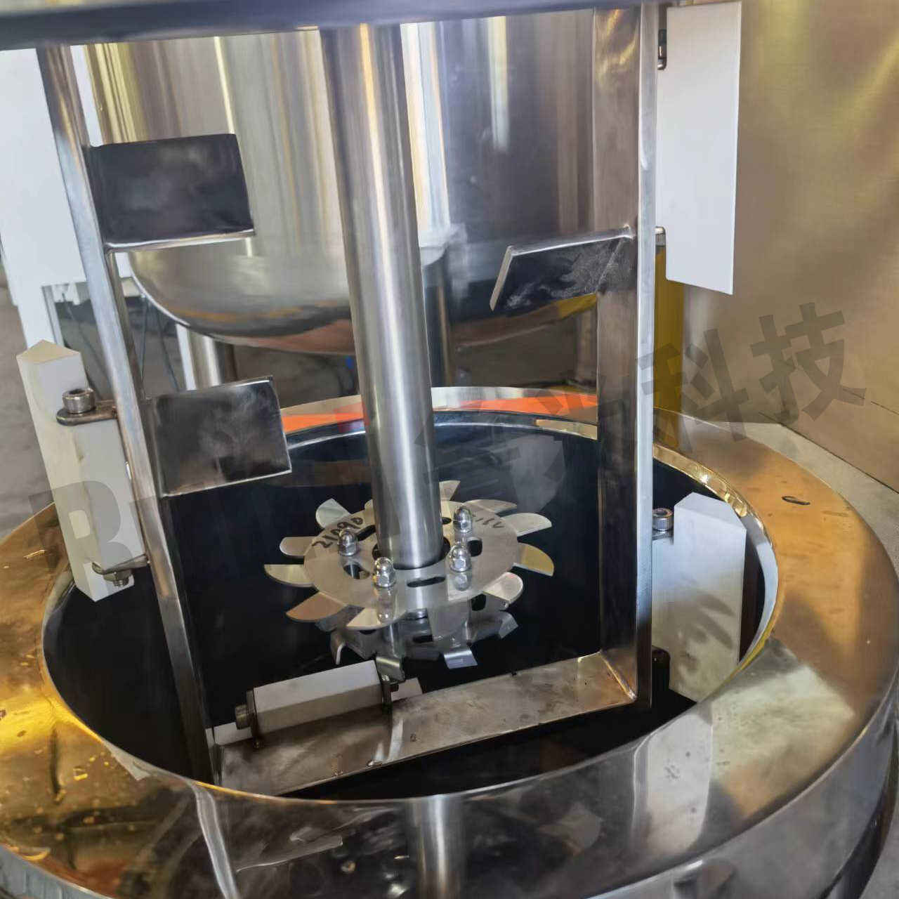 The mixer consist of two impellers: One high speed disperser in the middle and outer anchor frame type with PTFE scraper. The anchor paddle push the material to the edge of the dispersing disc and the scraper remove the mixture from the inner vessel. Such combination enchance the mixing efficiency much more compared with one single paddle structure.